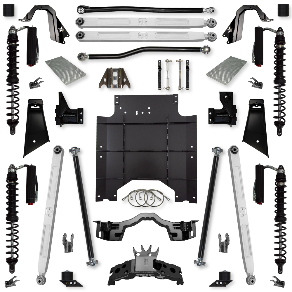 Rockzilla features massive 12.5" Travel 2.625" RRD Remote Reservoir Racing Coilovers up front yielding 13.89” of axle travel, 13" Travel 2.625" RRD Remote Reservoir Racing Coilovers in the rear yielding 14” of axle travel and come with Fast CD (Compression Dampening Adjusters) on the upsized 3.25” Diameter Reservoirs. Rockzilla is designed around axles that have a 72" WMS minimum, wheels that have 3.5" back spacing and 40" – 42” tall and 13.5" wide tires or functional equivalent. Once installed your JKU will become an off road Monster! Slight customization of the system is available for various power trains and axle combinations. Please discuss all your particular needs with a Rock Krawler Technician prior to order (518-270-9822). Lead times will apply.