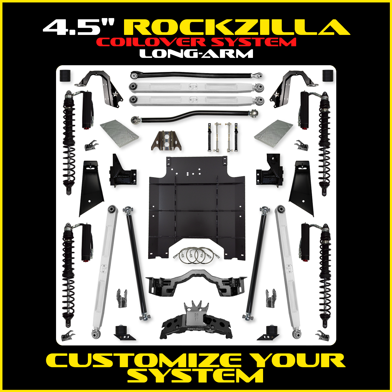 Rockzilla features massive 12.5" Travel 2 5/8 RRD Remote Reservoir Racing Coilovers up front yielding 13.89” of axle travel, 13" Travel 2 5/8 RRD Remote Reservoir Racing Coilovers in the rear yielding 14” of axle travel and come with Fast CD (Compression Dampening Adjusters) on the upsized 3.25” Diameter Reservoirs. Rockzilla is designed around axles that have a 72" WMS minimum, wheels that have 3.5" back spacing and 40" – 42” tall and 13.5" wide tires or functional equivalent. Once installed your JKU will become an off road Monster! Slight customization of the system is available for various power trains and axle combinations. Please discuss all your particular needs with a Rock Krawler Technician prior to order (518-270-9822). Lead times will apply.
