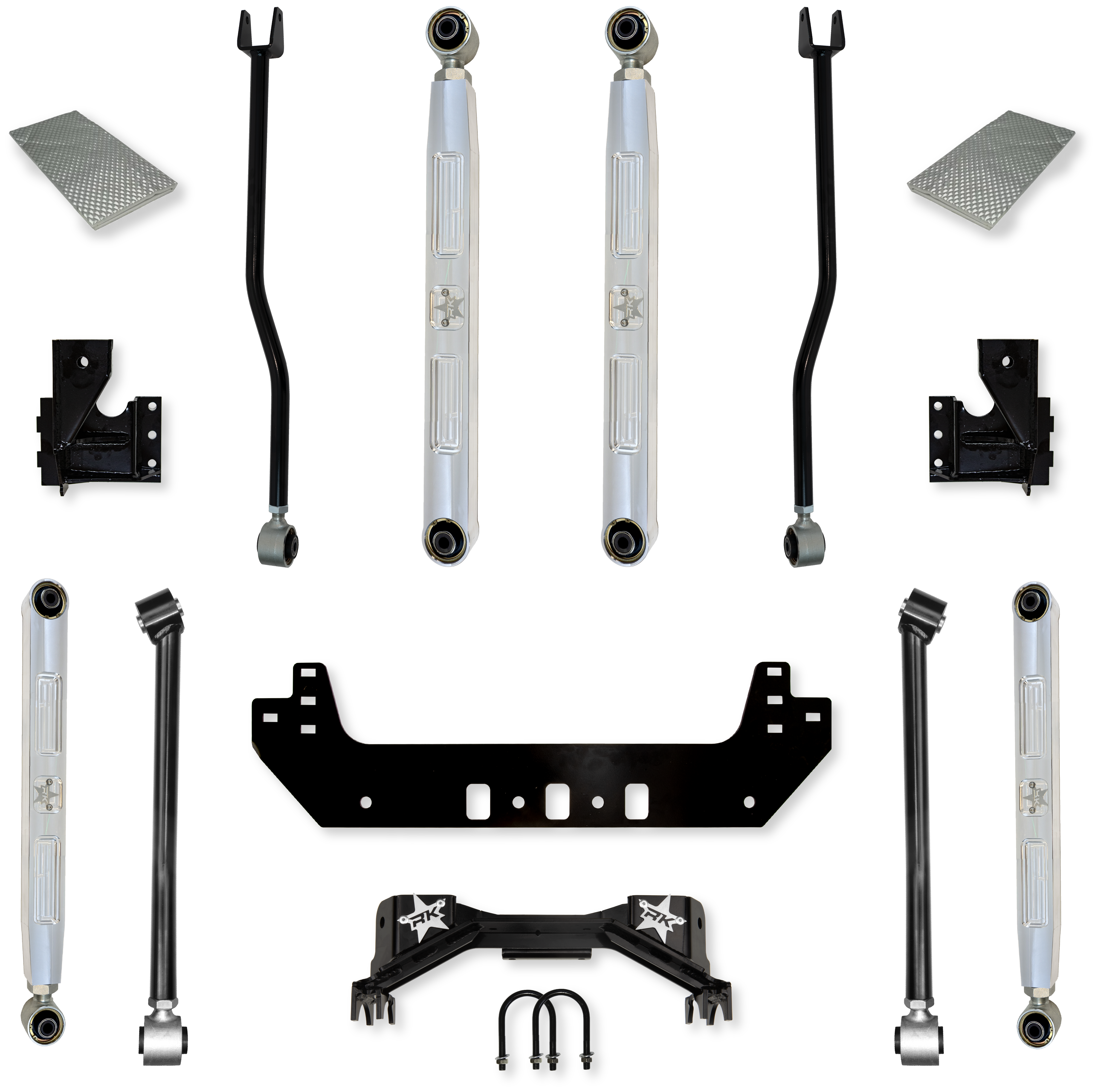 The Rock Krawler Silverback PRO ELITE Upgrade System is the ultimate performance upgrade for your Jeep Gladiator JT. This Designed for serious off-roaders who still drive their Gladiator daily, this system blends high-clearance off-road performance with on-road comfort and precision. At the heart of this kit is a high-clearance 4-link front suspension and a triangulated 4-link rear setup, providing maximum articulation and control without the bind of traditional track bar setups. The rear triangulation eliminates the rear track bar entirely for smoother highway handling and superior axle centering. The lower control arms add the “Bling” factor. The PB+J (Pure Beef and Jealousy) lower control arms are machined from 2”x3” billet 7075 Aluminum for incredible strength and appearance. All the control arms offer 70° of misalignment and fully adjustable upper and lower control arms for precision tuning of your Gladiator's caster and pinion angles.