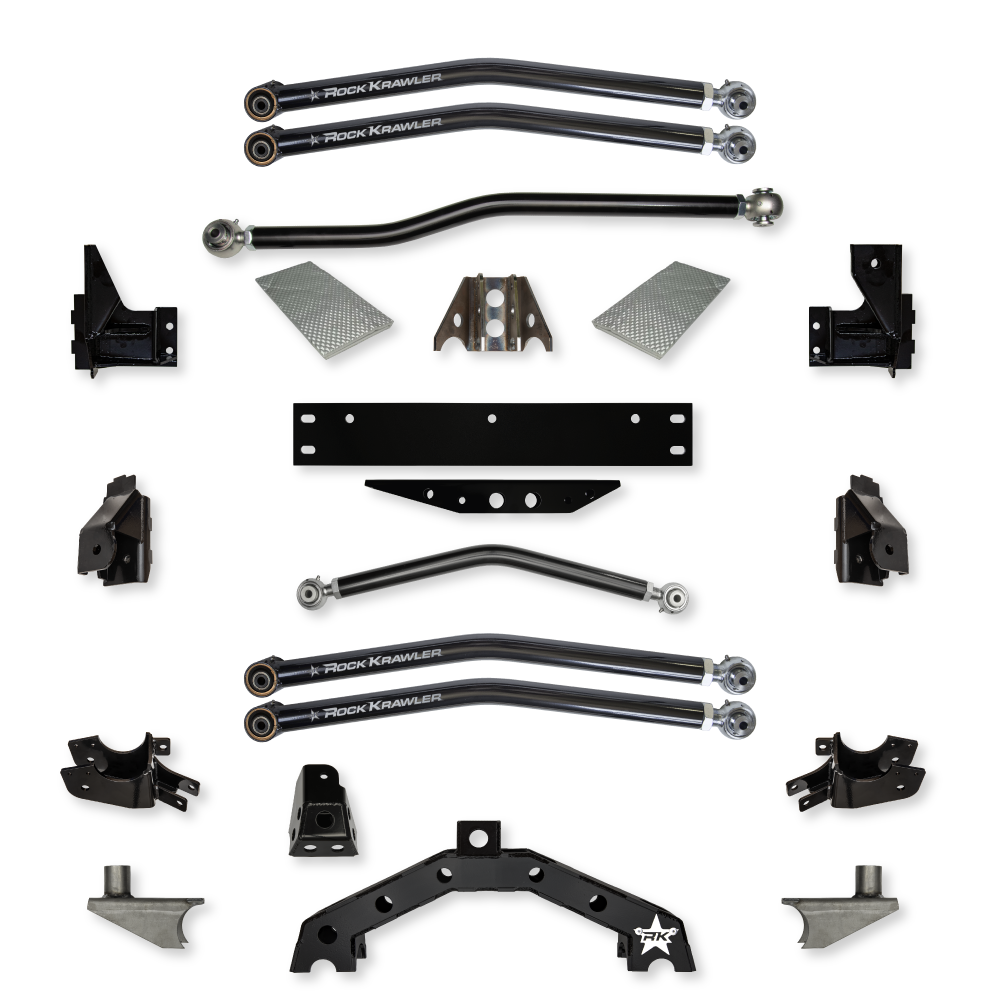 The Rock Krawler JK X Factor X2 Systems is the ultimate JK Long Arm for the trail. The X Factor systems feature 3 link rear set-up front & rear for maximum articulation and off-road performance. The rear suspension provides the tried and true independent 3 link conversion with X2 rear suspension geometry. New high clearance axle mounts provide improved ground clearance under the rear axle as compared to stock. The combination of high clearance mounts and 3 link suspension geometry lets you dominate the trails.