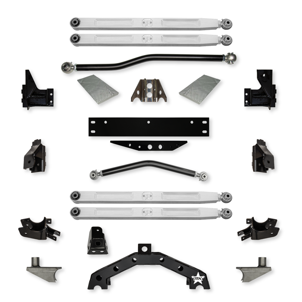 The Rock Krawler Suspension 4.5" X - Factor X2 6" Stretch PRO ELITE Long-Arm System is the ultimate in compromise between daily driver/hard core off-roader. PRO derives from having a set of PB&J (Pure beef and jealousy) Billet aluminum lower control arms. These arms are custom machined in-house, built using a solid square stock bar of BILLET aluminum and engineered to quite literally, handle any abuse you can throw at them. The X - Factor X2 systems combine the benefits of a independent 3 link front and rear suspension system. This is where conventional on road handling meets bad ass off-road ability. Our proprietary design utilizes a double adjustable front and rear upper control arm that upsizes the factory hardware to 14mm, 2 3/8" mounting width and 1" Pro Krawler joints at one end. The rear system uses our tried and true independent 3 link conversion with X2 rear suspension geometry with enhanced rear instant center(s) and rear roll center(s). We provide the necessary brackets and control arms needed to achieve a 6" rear suspension stretch in order to give an enhanced wheelbase. This helps with greater off-road capability and better on-road handling characteristics in a 2-door wrangler. The new high clearance axle mounts provide 3.5” of ground clearance under the rear axle as compared to stock. The rear upper shock relocation brackets ensure you do not lose any shock or suspension travel.